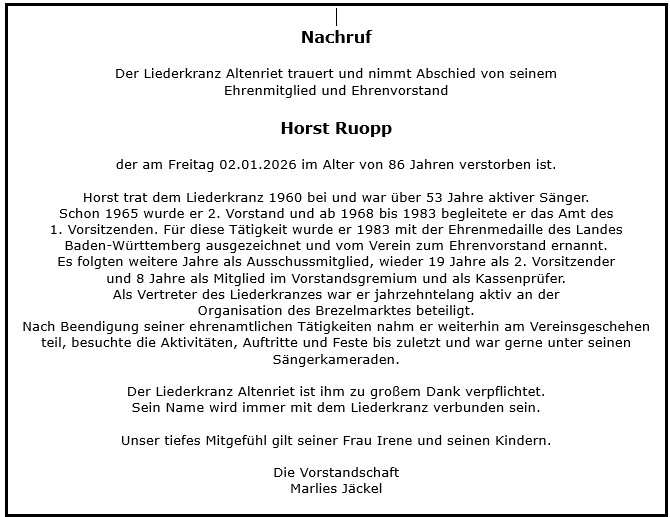 Die Trauerfeier mit Urnenbeisetzung findet am Dienstag, 20.01.2026 auf dem Friedhof in Altenriet statt.